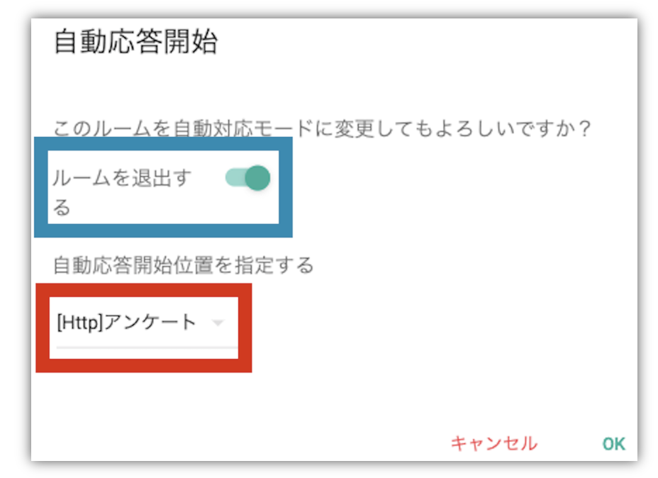 ※「ルームを退出する」を有効化した場合、自動的にルーム終了されます。