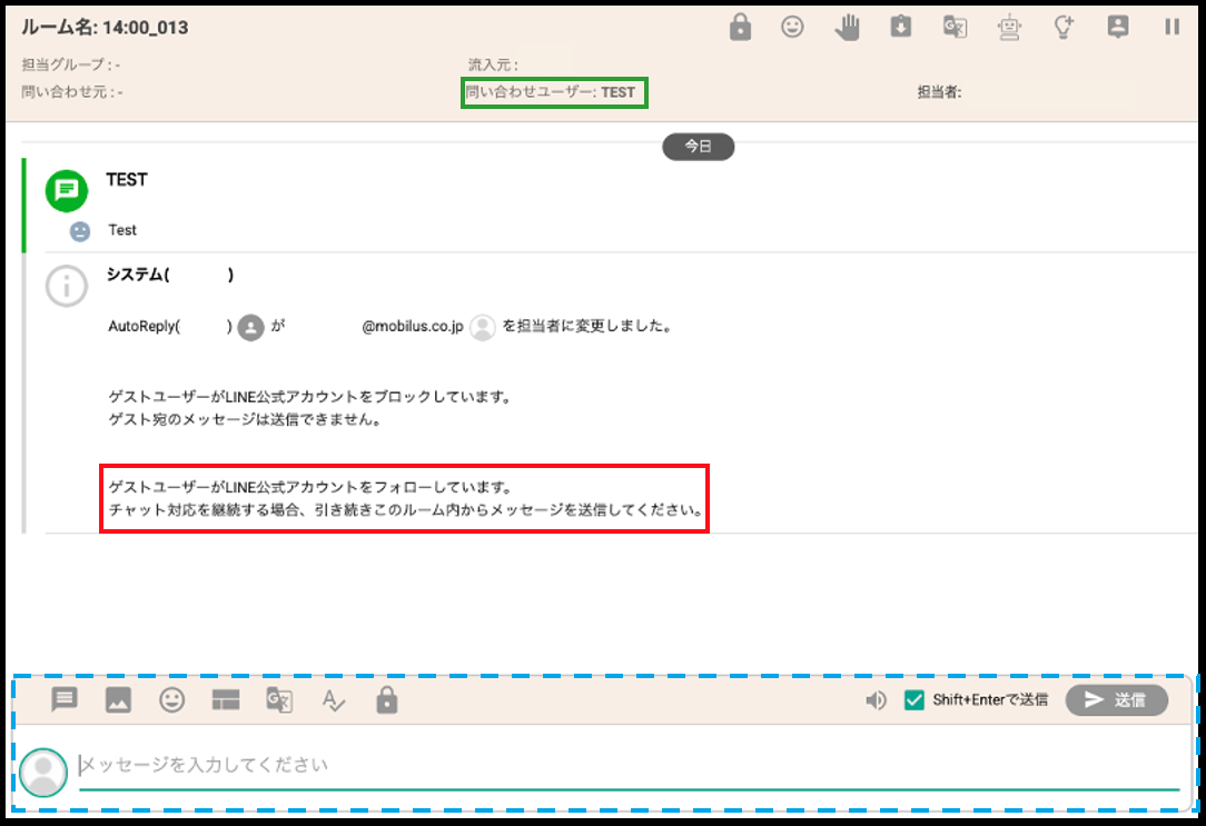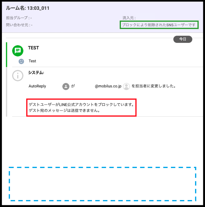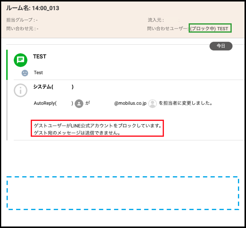 LINE経由の有人対応を行う途中で、 本改善により、ゲストユーザーに届かないメッセージの ◼️ケース1 ▼前提設定 ▼ブロック時の挙動 また、ゲストユーザーのLINEブロック状態は以下の画面からご確認することが可能です。 ・(管理画面)コールセンター管理 ▶︎ ゲストユーザー検索 ▶︎ ゲストユーザー詳細画面 ▶︎ユーザー属性 ▶︎ ブロックステータス