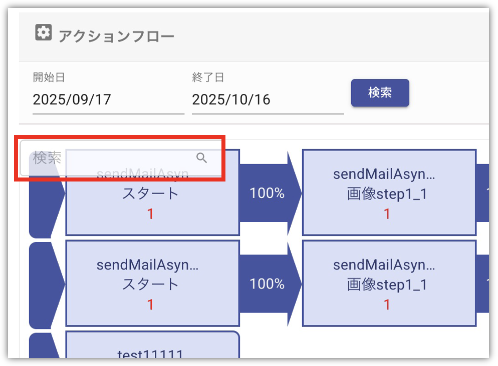 アクションフロー画面で検索窓を追加します。 ◼️対象画面 MOBI BOT ▶︎ 統計 ▶︎ アクションフロー ◼️変更前 |